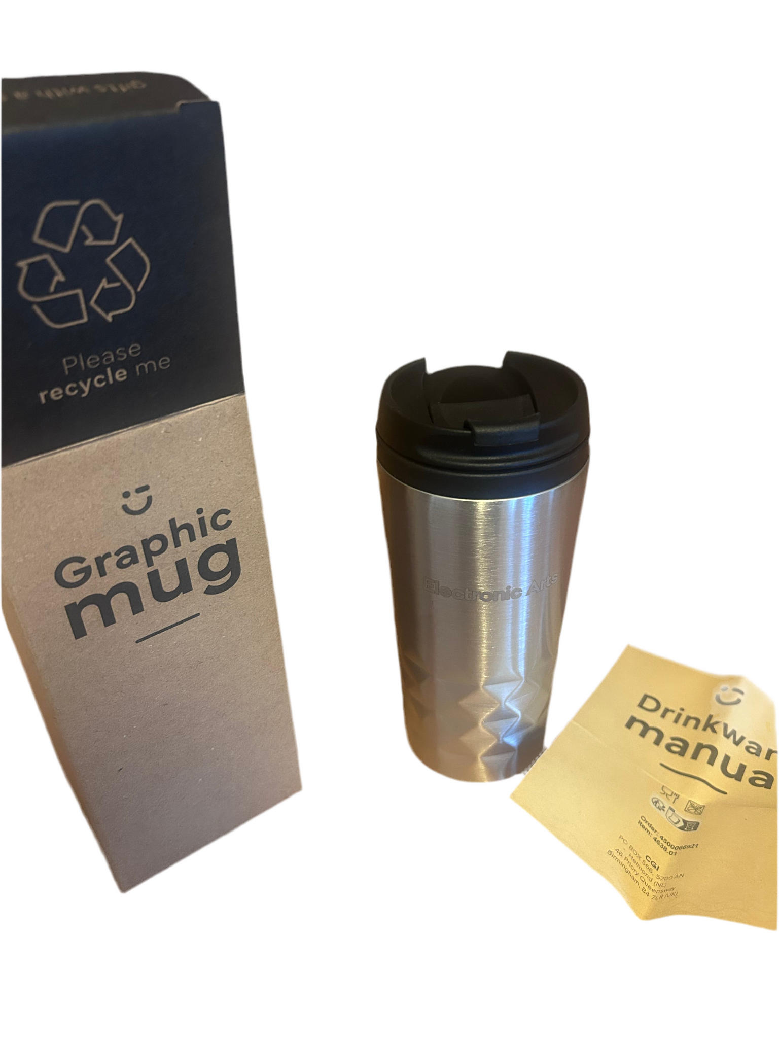 Double-walled, leak-proof stainless steel thermo cup with screw cap, click opening. PP inner wall. With distinctive 3D geometric diamond pattern on the holder. Non slip base. Capacity 300 ml.